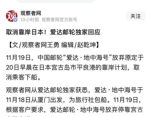 另外,木叔注意到,日本媒体还关注到了一件与中国人赴日旅游有关的事情。 一艘核定载客2600多人的中国国企游轮,11月18日从福建厦门出发到日本冲绳旅游。 预计11月20日一早抵达冲绳县宫古岛市平良港停泊,让游客下船观光。 不过11月19日临时通知日方,不停靠平良港了,也取消了乘客下船以及这次行程,当天会返回中国。