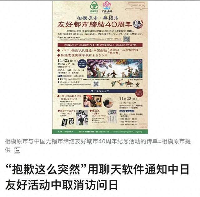 日方认为,中国政府的反制措施影响了无锡市的行程。尽管无锡市不派人出席,日方活动还会按计划举行。 无锡用社交媒体通知取消,没发正式公函,说明事发紧急,由此能看出我们对日本反制措施的强硬态度。 此外,原定在11月下旬到滋贺县访问的湖南省总工会代表团表示访问延期。 中日民间交往立即停顿的事情还有很多。